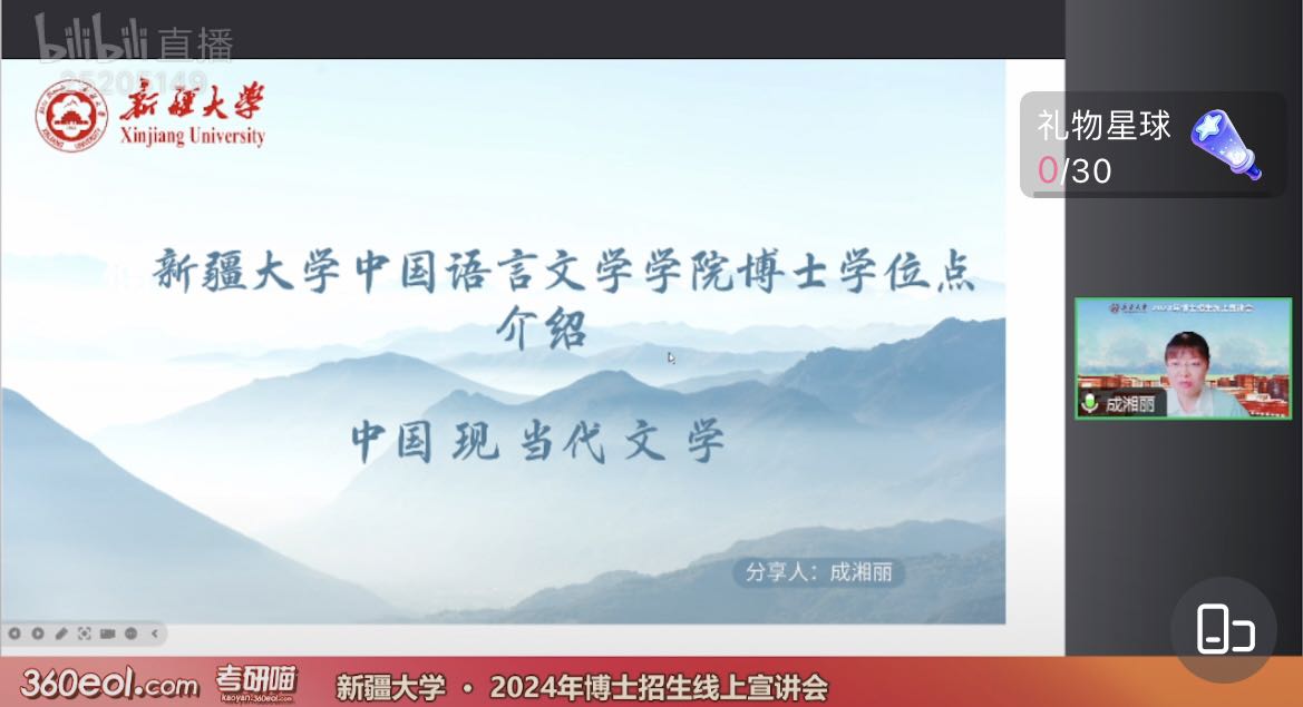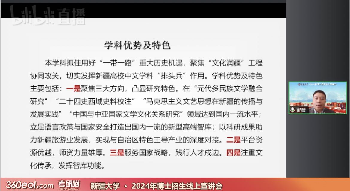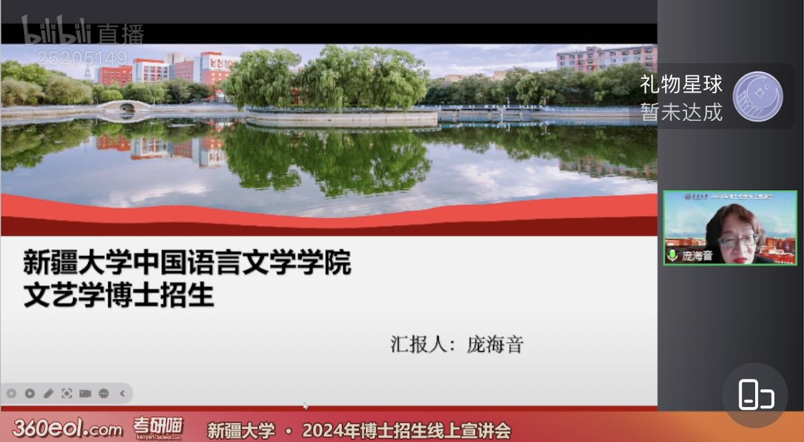 直播宣讲中,我院院长邹赞就学院基本情况向广大考生及家长予以详细介绍;高志副院长则向大家介绍了我院中国语言文学学科及各二级学科方向招生情况;朱贺琴教授结合自身指导博士生经验,分享学院在博士生研究生指导等方面的特色与亮点;庞海音教授与成湘丽教授分别就文艺学专业和中国现当代文学专业师资力量、课程设置、科研条件提供等进行介绍;武汉大学援疆教授、学院副院长就自己入职新大后的所见所闻,向考生和家长予以介绍,老师们的分享让考生和家长更加深入地了解我院的教学实力、科研水平和文化氛围,为考生们提供了宝贵的经验和建议。最后,在互动环节,考生们积极提问,我院老师就考生和家长普遍关心的问题进行了耐心细致的解答耐心解答,现场氛围热烈而融洽。